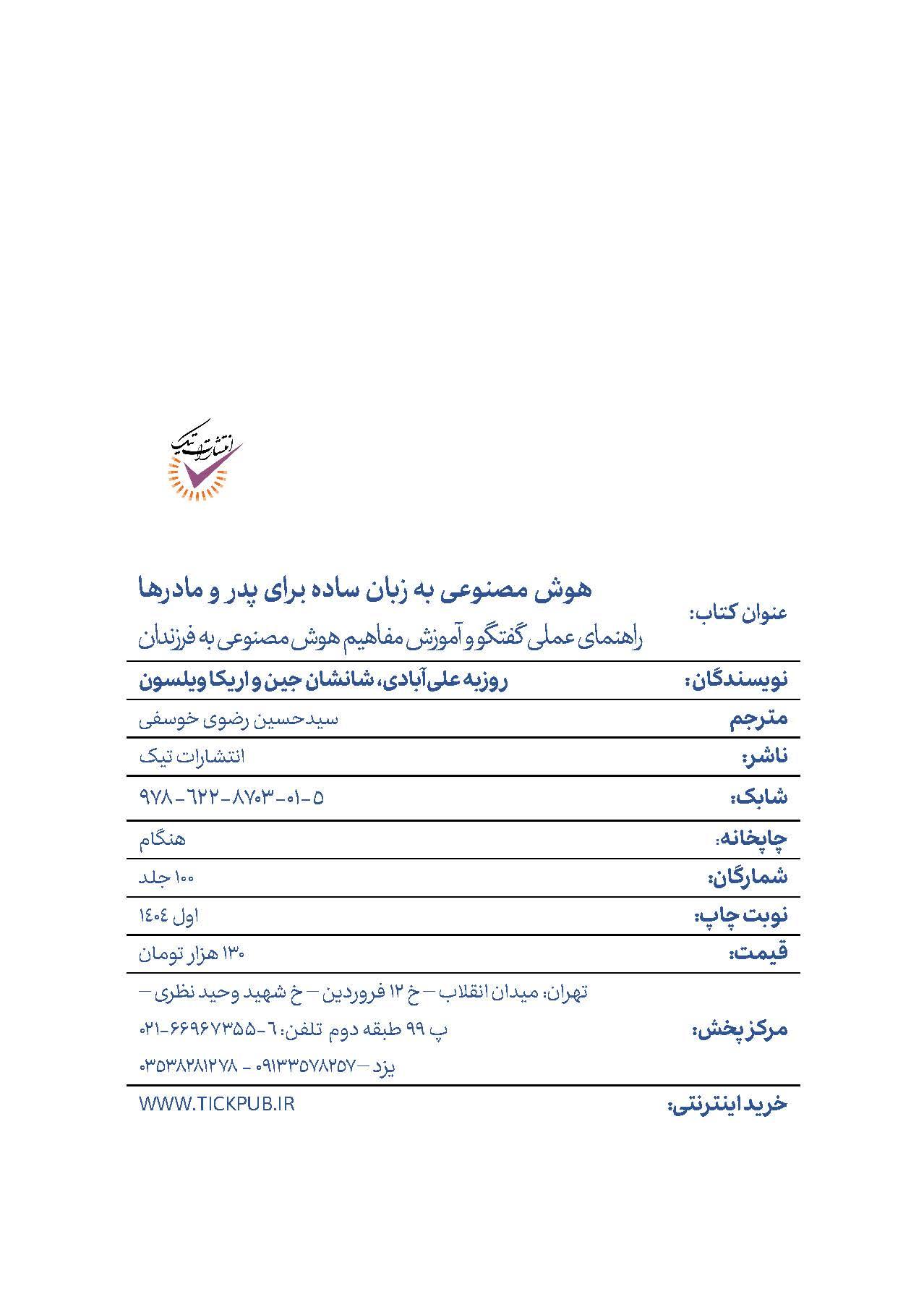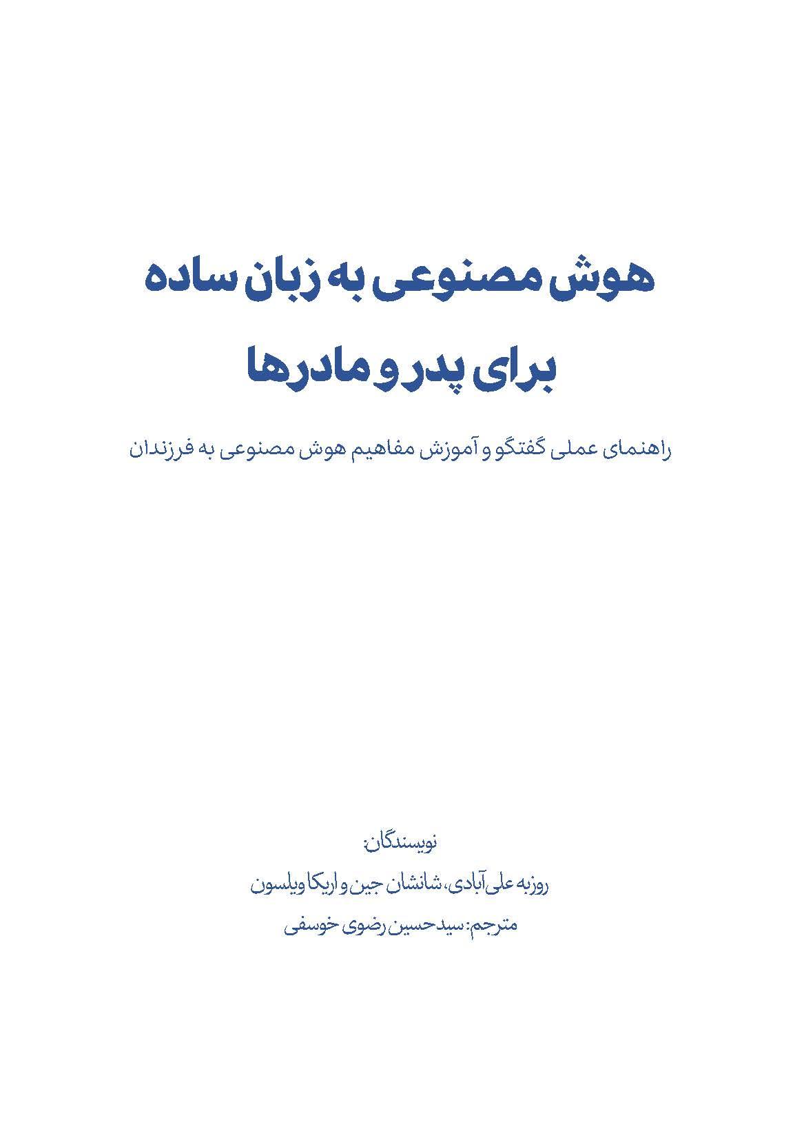کتاب «هوش مصنوعی به زبان ساده برای پدر و مادرها» نوشتهٔ روزبه علیآبادی، شانشان جین و اریکا ویلسون با ترجمهٔ سیدحسین رضوی خوسفی توسط نشر تیک منتشر شده است. این کتاب بهعنوان جلد هشتم از مجموعهٔ سواد هوش مصنوعی، راهنمایی کاربردی برای والدین است تا بتوانند مفاهیم هوش مصنوعی را به زبان ساده به فرزندان خود آموزش دهند و گفتوگوهای سازندهای در این زمینه داشته باشند. نسخهی الکترونیکی این اثر را میتوانید از طاقچه خرید و دانلود کنید.